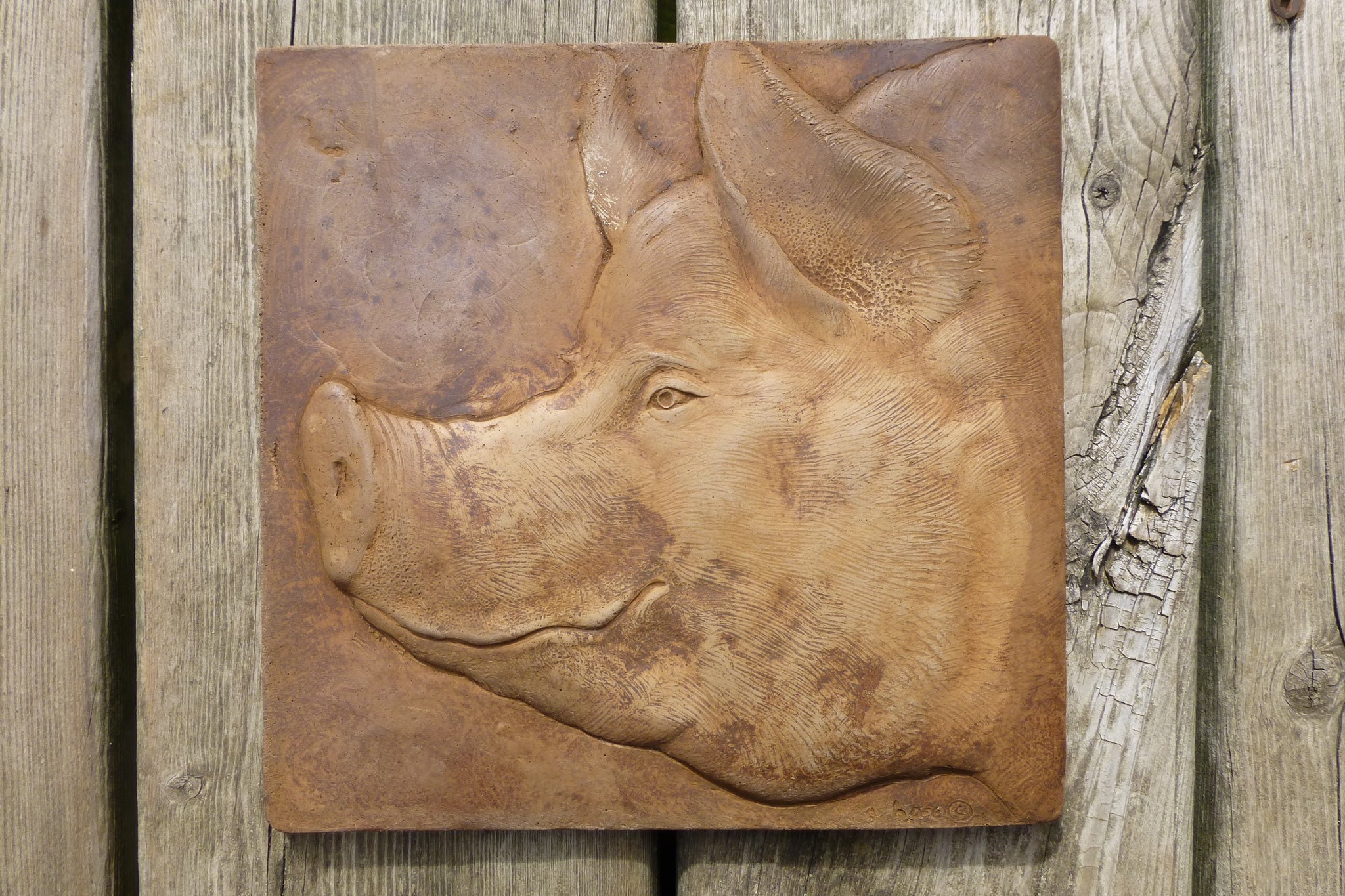 A portrait of a contented looking pig. This tile has an 'earthy' look to it. A neighbour who breeds Tamworth pigs allowed me to study his animals and this relief tile was the result.
