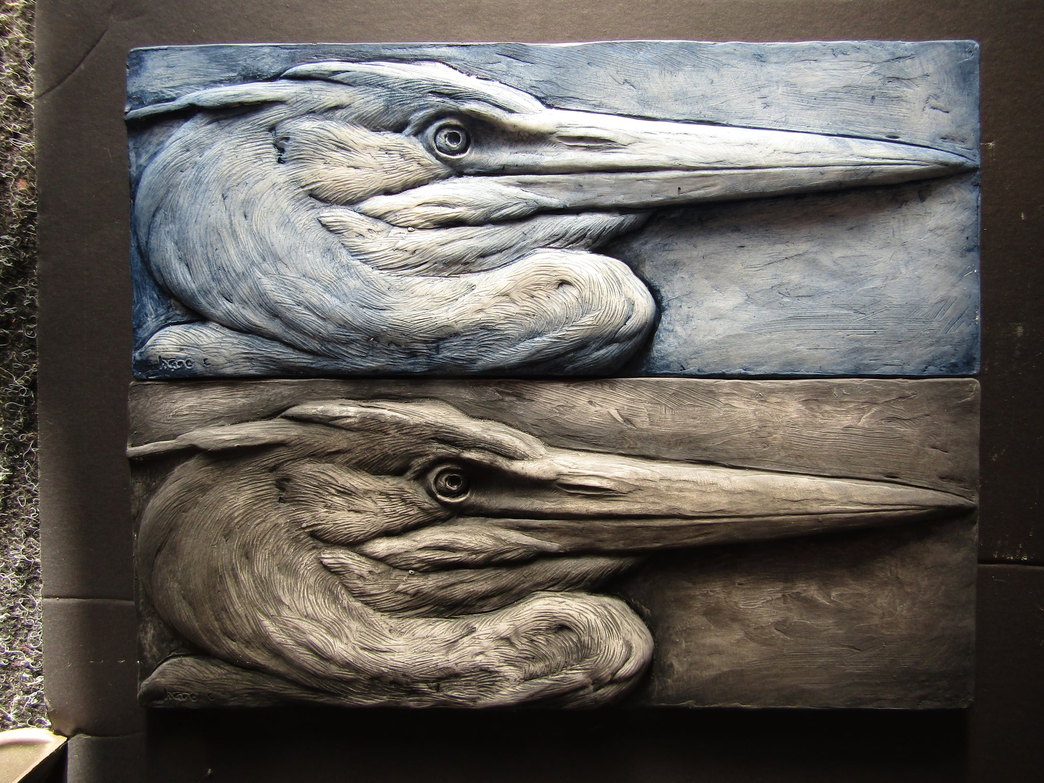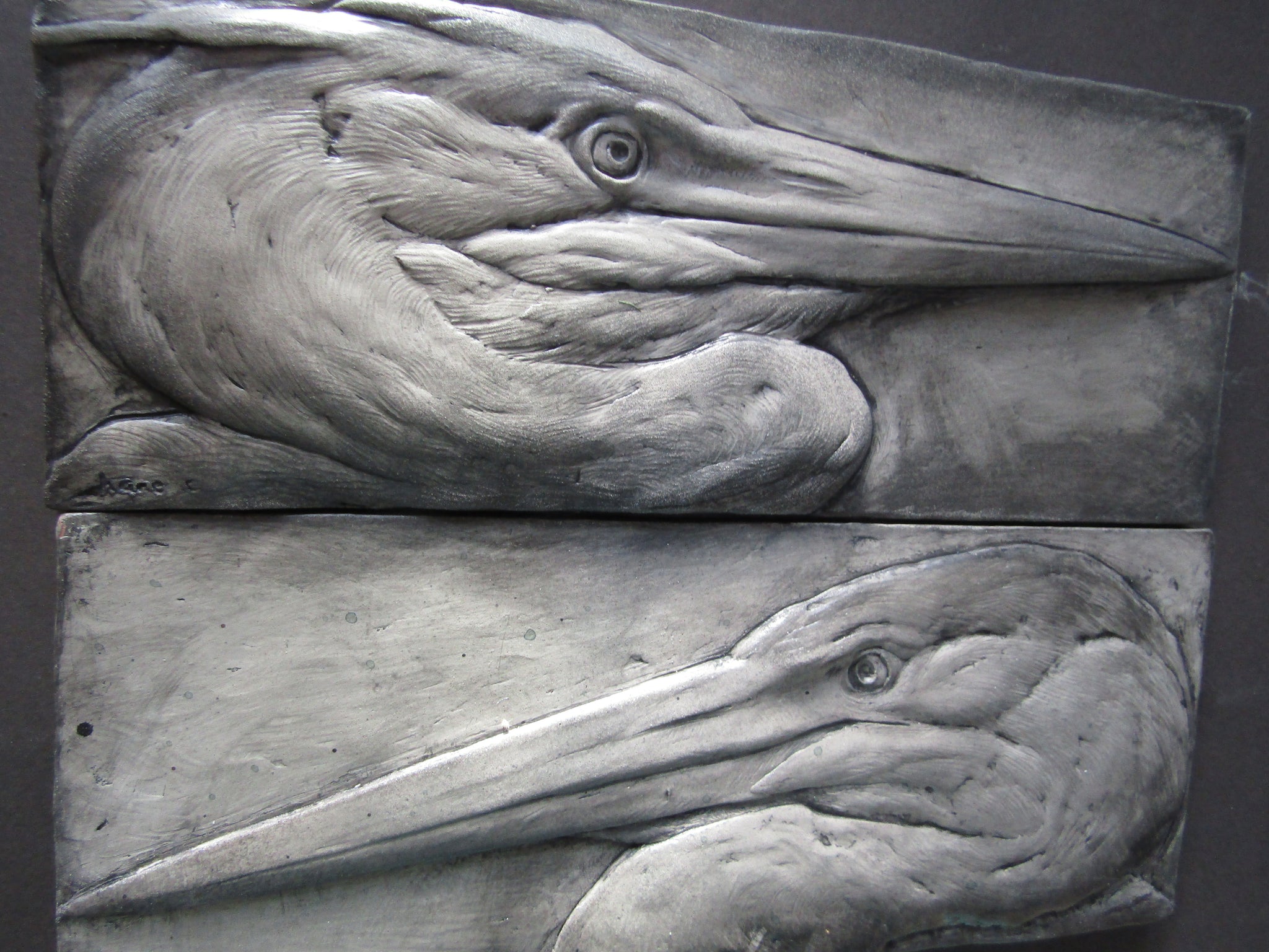 Two heron profile portrait sculptures. Looking right and looking left to complement each other and create a dynamic display!