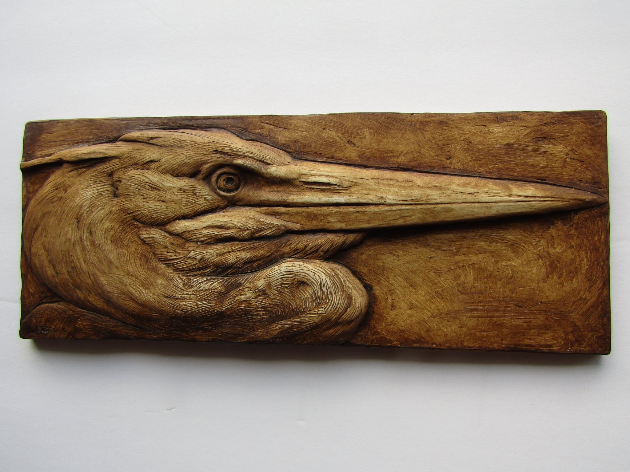 A hydrostone relief sculpture of a great blue heron looking to the right. Very detailed rendition of these fantastic , almost prehistoric looking birds.