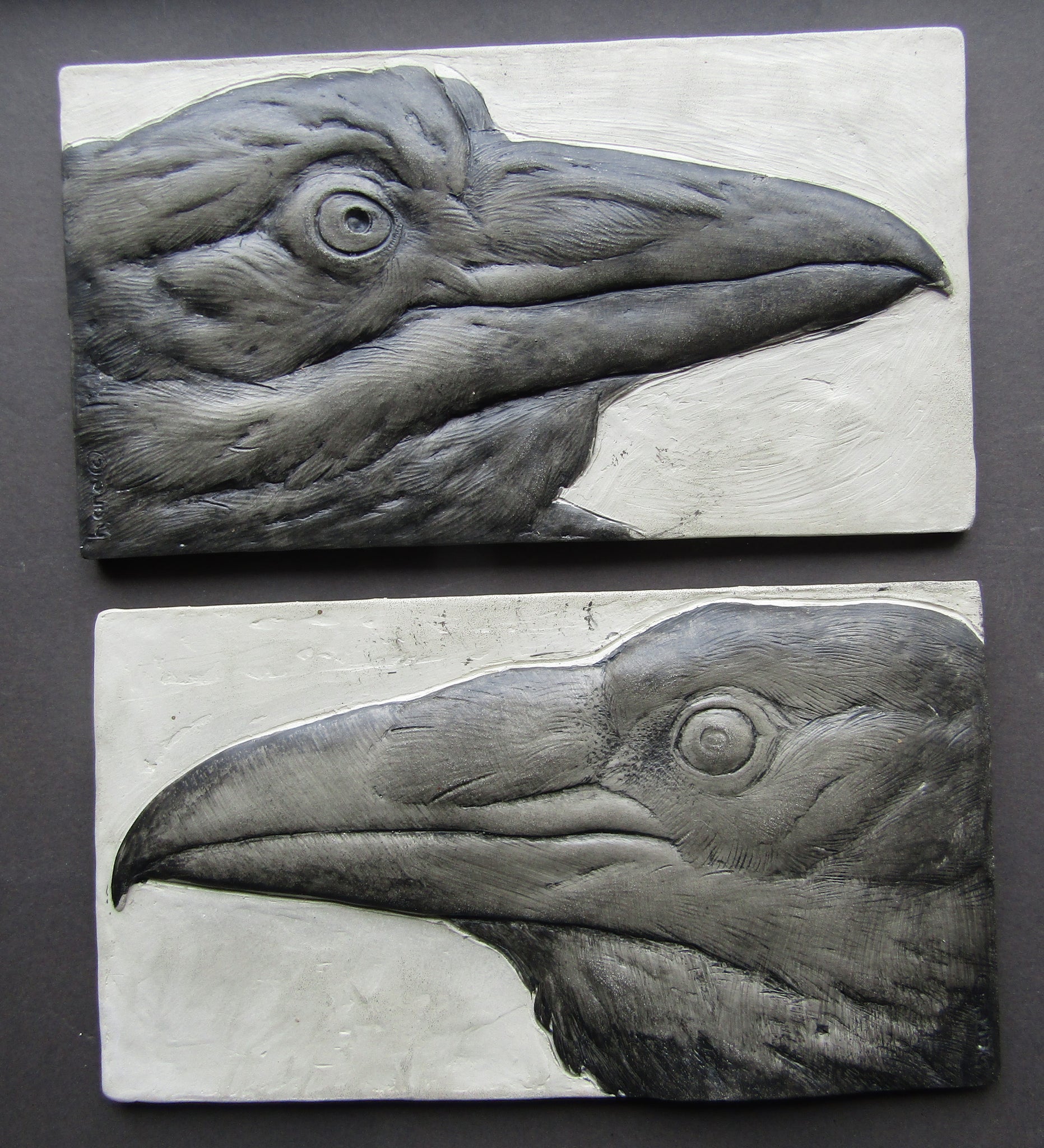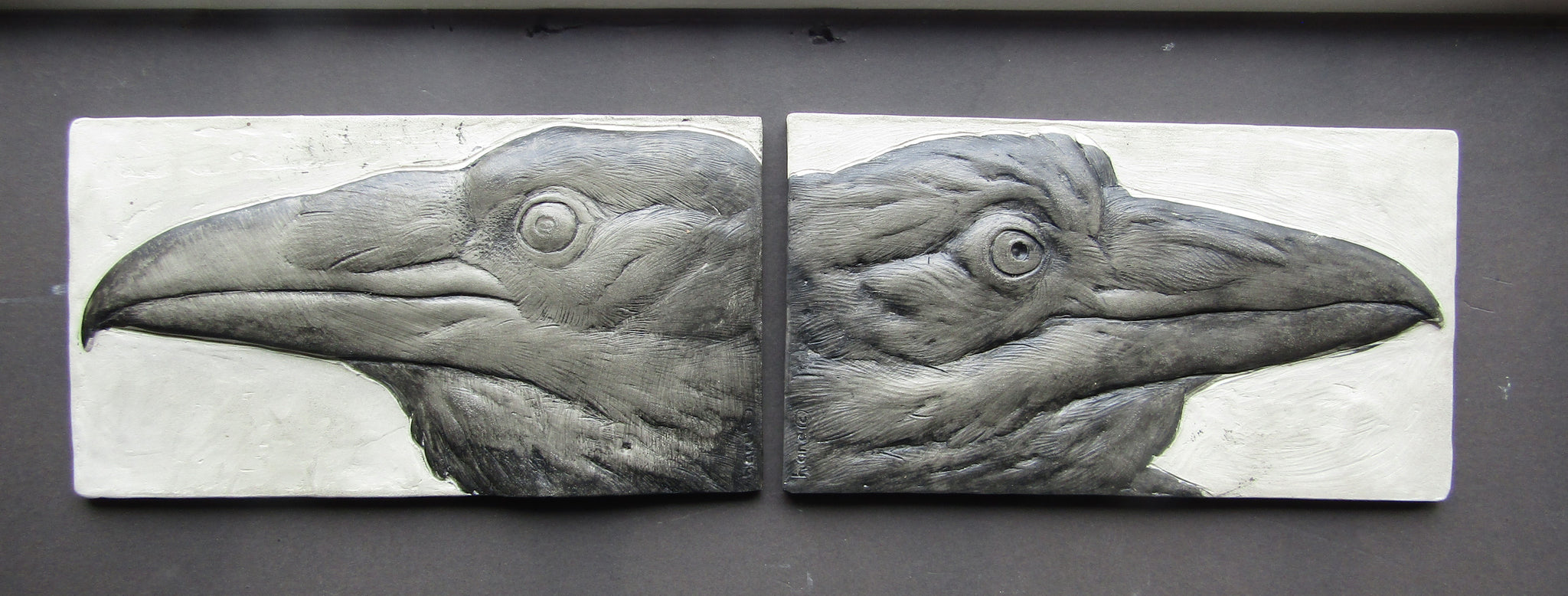 My two raven portrait tiles, paired right and left looking, to create a more dynamic effect!