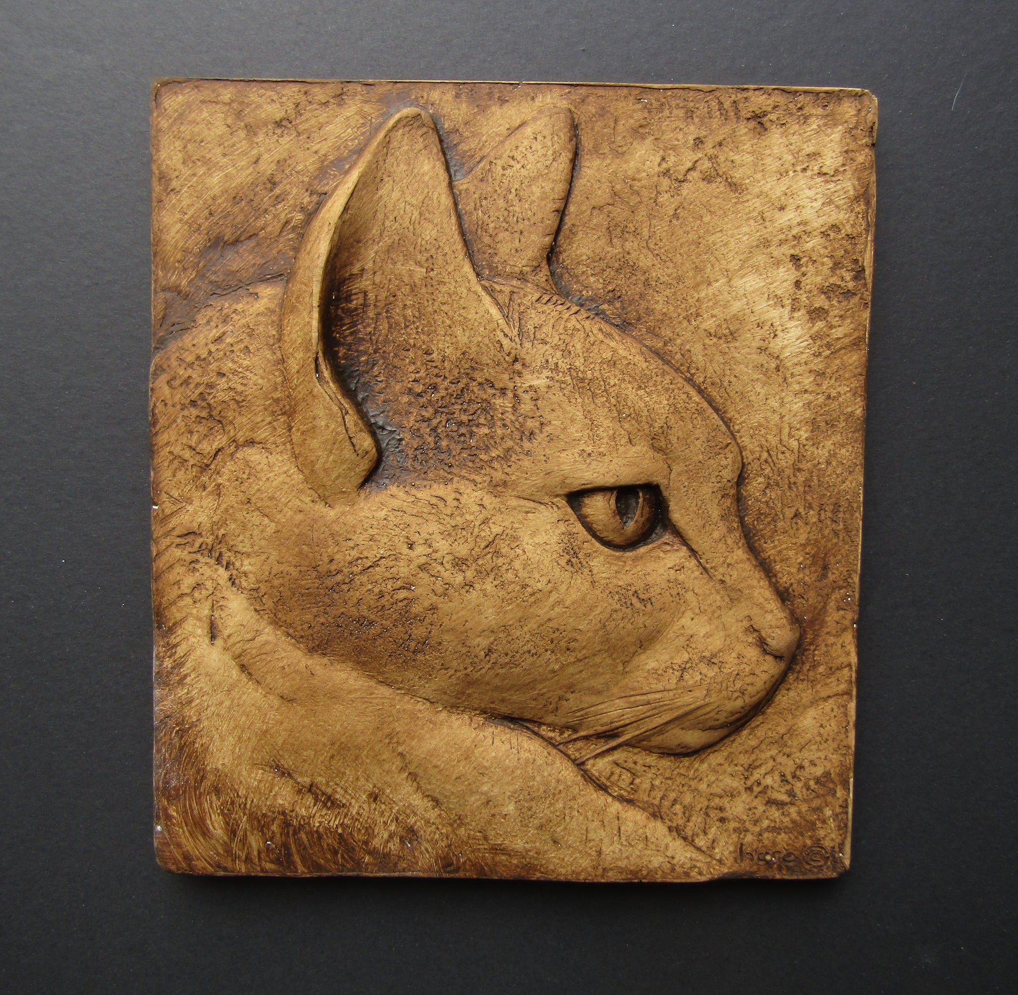 Rufus, we think had a lot of Siamese cat in him. Something gave him an exotic, iconic look. I make Ancient Egyptian art reproductions for museums. There might be a bit of that influence in this artwork as well.