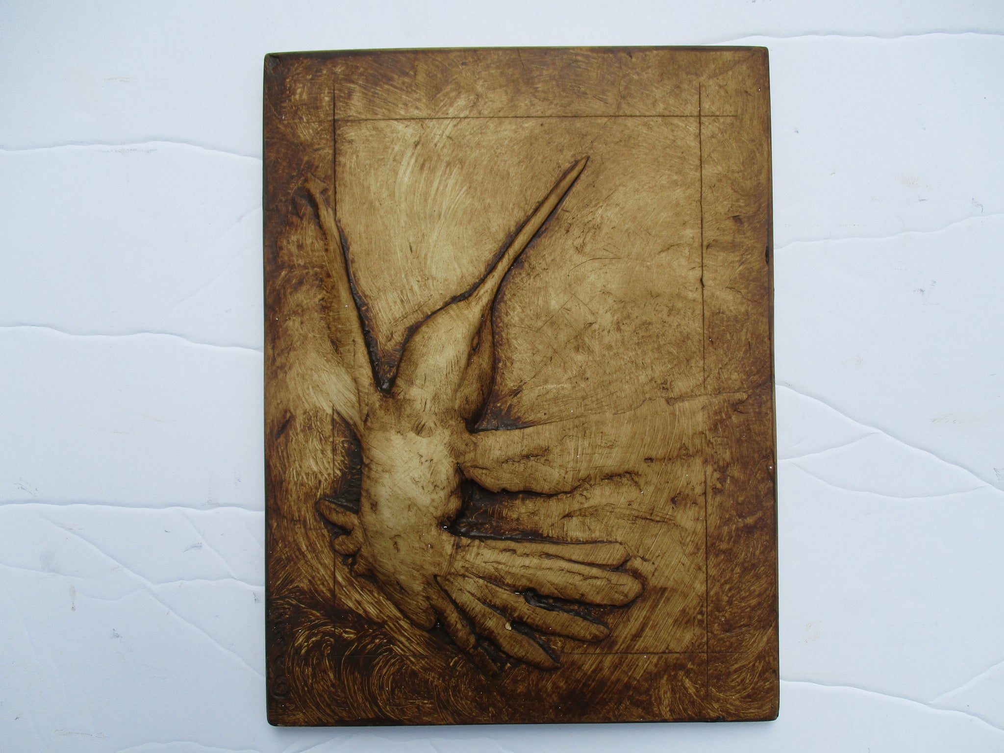 From my original sculpture in soft clay, I make a mold and cast hydrostone or concrete into the mold to create unique wall sculpture or tiles. These one of a kind artworks are then carefully colored by hand . No two are ever alike.