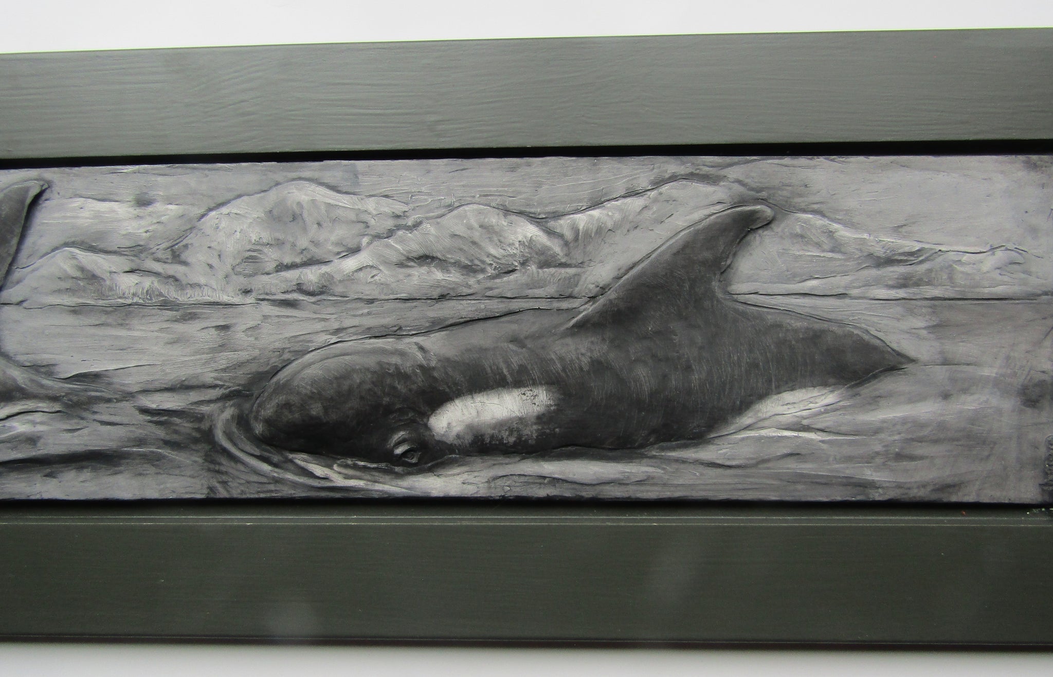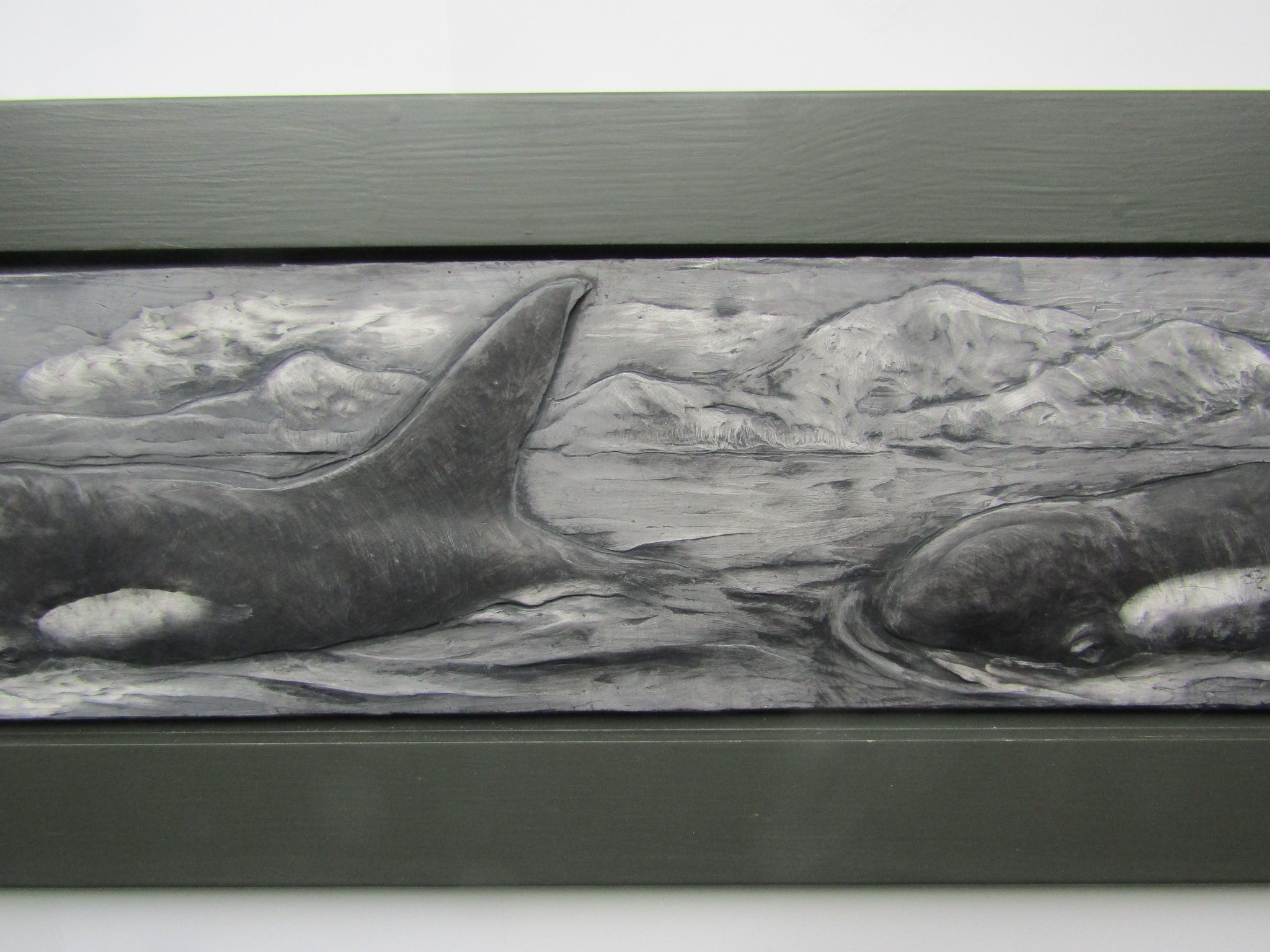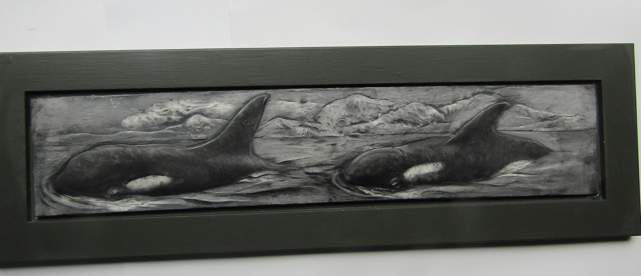 A large relief sculpture of three orca whales , hand cast and colored.
